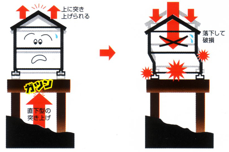 地盤改良や杭工法などで強い地盤にした場合、下図のように岩盤からの突き上げがそのまま建物に直撃します。その結果新潟県中越地震では、地震の突き上げで柱が折れたり、跳ね上げられた建物が杭や基礎の上に落ちて大きな被害が発生しました。